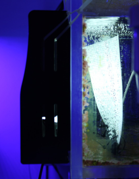 The Upflow Algae Scrubber (UAS) provides the best growing conditions for algae in your tank: Air bubbles provide rapid turbulent flow; Strong lighting provides the light; and the nutrients that are already in your water provide the nitrate and phosphate. All that's needed is a place for the algae to attach to, and that is provided by the roughed-up plastic screen. Thus the algae start growing on the screen because the flow and lighting are stronger there than they are in the rest of your aquarium; nitrate and phosphate are consumed in the process. This causes algae to start disappearing from your aquarium and start re-appearing on the scrubber screen, so that you can throw the algae away every week or two.