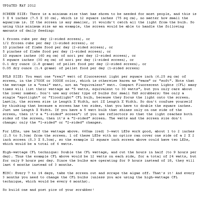 This new test version of the algae scrubber is much easier to build than the waterfall version (the Mega Powerful one), and is perfect for nano's. This new scrubber has never been posted before May 2012. It works in both freshwater and saltwater.