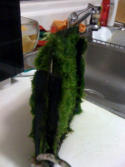 So where have these filters been all this time, and why haven't you heard of them if they work so well? Well the original waterfall version (the Mega Powerful thread posted in August 2008) was hard to build, and was not really for sale anywhere; so unless you liked to build things from scratch, you had no choice but to buy some other kind of filter. All the filter really needed to do was to create good growing conditions (light, flow, nutrients) for the algae, by flowing the water across a piece of rough material, so that the algae would grow on the material instead of somewhere else in the aquarium. The waterfall algae scrubber did grow lots of algae in the filter, and it removed lots of algae from aquariums: Over 1,000 people built their own waterfall algae scrubbers, and reported their results on various forums during a 4 year period; almost all of them wiped out their nuisance algae within 8 weeks, and many did so in 4 weeks. And on other forums that I never posted on, an estimated 10,000 people built their own waterfall algae scrubbers with similar results.