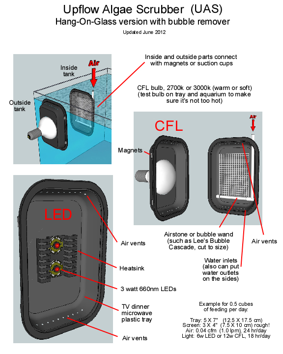 A little over a year ago in April 2011, another idea came along: Instead of letting the water flow down a screen like a waterfall, how about you let the water flow up the screen using air bubbles? Why? Because as good as waterfall algae scrubbers are, they still need a place for the water to drain "down" to. This means that you need to have a sump below the aquarium, or you need to have the scrubber up above the aquarium. This is not easy, and is very difficult for a nano aquarium which usually has no sump below it, and no room above it. Also, the waterfall version requires it to be out of the water (in the air), which takes up extra space. The new "upflow" version, however, can be placed inside the aquarium, so that it takes up no extra space at all, and it needs no external plumbing or water pumps at all. Only air bubbles.
