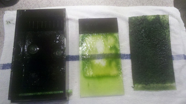 So where have these filters been all this time, and why haven't you heard of them if they work so well? Well the original waterfall version (the Mega Powerful thread posted in August 2008) was hard to build, and was not really for sale anywhere; so unless you liked to build things from scratch, you had no choice but to buy some other kind of filter. All the filter really needed to do was to create good growing conditions (light, flow, nutrients) for the algae, by flowing the water across a piece of rough material, so that the algae would grow on the material instead of somewhere else in the aquarium. The waterfall algae scrubber did grow lots of algae in the filter, and it removed lots of algae from aquariums: Over 1,000 people built their own waterfall algae scrubbers, and reported their results on various forums during a 4 year period; almost all of them wiped out their nuisance algae within 8 weeks, and many did so in 4 weeks. And on other forums that I never posted on, an estimated 10,000 people built their own waterfall algae scrubbers with similar results.