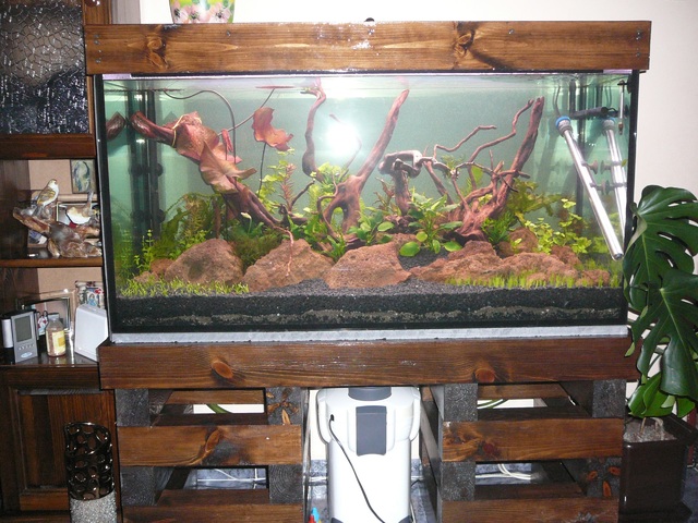 Да добавя, че всеки шкаф - дървен ( или плоскости по тънки даже - с 18 mm), скроен и направен кадърно ще ти носи аквата. Дори и маса на 4 крака, при правилно разпределение на тежестта ще се справи. Номера на китайката е, не дай си боже, ако удари някакво земетресение, дори и леко, основата под аквата да издържи на хоризонталното усилие. От тази гледана точка, металните стойки, облечени с ПДЧ са по добро решение, макар и не евтино такова. Пак от тази гледна точка, по-горе наблегнах на необходимостта гърба да бъде с еднаква дебелина, като на другите плоскости, тоест да носи.