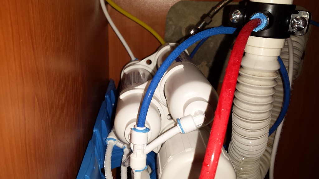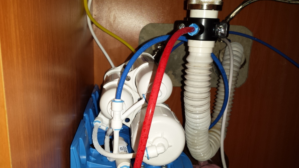 На снимката-червения маркуч отива в канала,синия в бидона,жълтия е след минерализатора и отива в канелката,белия е преди минерализатора и отива в канелката.