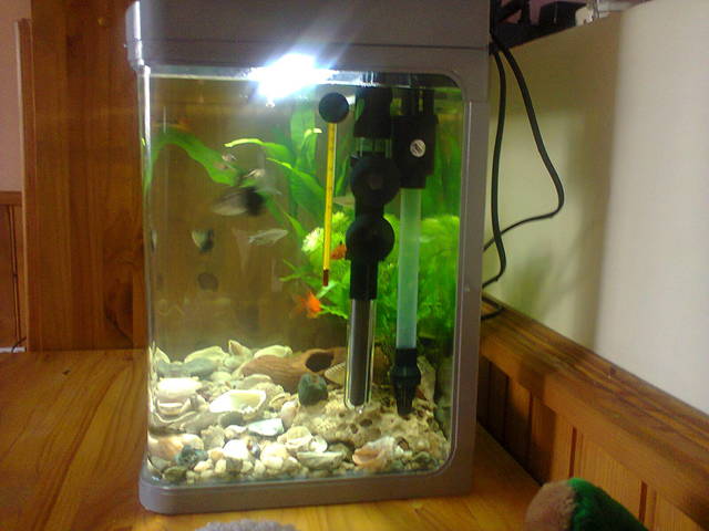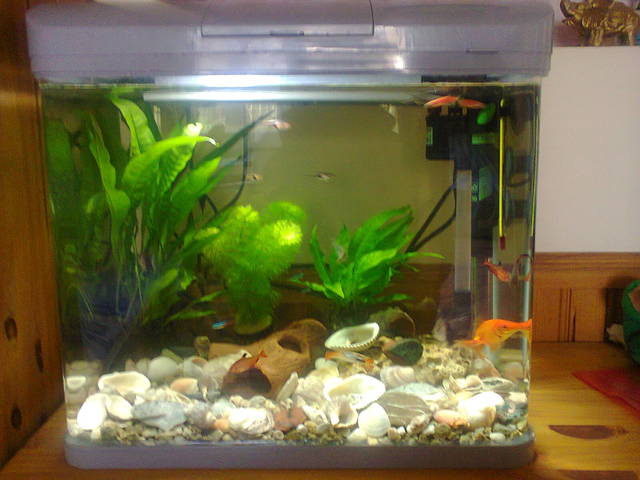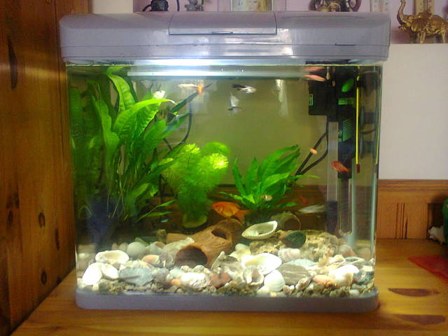 ОК !!! Мисля, че разбрах- в момента съм го направила точно така- струйките излизащи от филтъра падат върху гъбата и не пръскат по лампата - просто не бях сигурна дали това е правилният начин на поставяне - СЪЖАЛЯВАМ !!! Ето и няколко снимки на аквариума. На едната съм снимала и лампата , в която има вода, но не знам дали ще се види хубаво, защото е тъмно