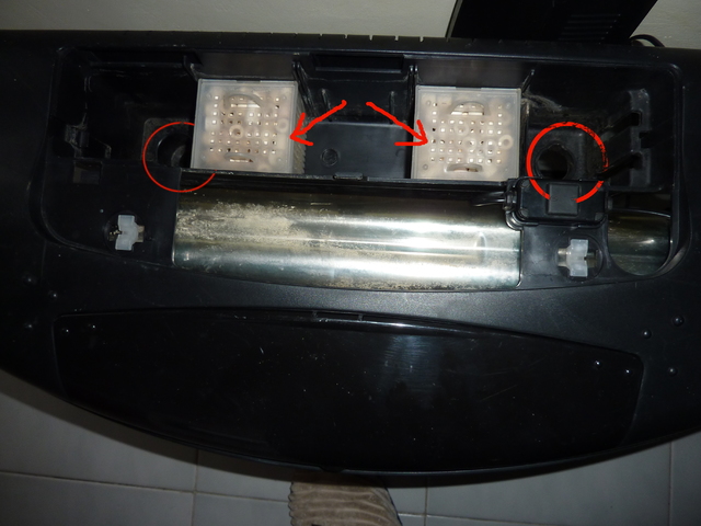 Капака отгоре - отворите са маркирани с червени кръгчета, а със стрелка са някакви контейнерчета пълни с гранули(предполагам, че са от филтърната част?).