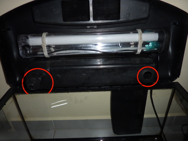 Така.. колега, това което имаш ти е само един капак с осветление. Липсва ти филтъра - на първия линк снимката. Той е под вода и засмуква водата. Закрепя се на този издаден мущук от твоя капак и излива водата върху тази керамика(тия бели гранули) като над тия гранули трябва да има една вата. Така водата се засмуква и се качва в капака минава през една надупчена тръбичка (виж втория и третия линк) и се отича през ватата после през керамиката и се излива от другата дупка в аквариума ти. Това е филтрацията. А нагревателя си е съвсем отделно устройство. Съвета ми е да идеш до някой магазин и да си земеш липсващите неща.