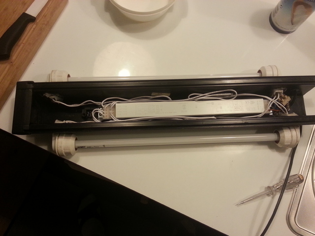 Реших да си подсиля осветлението като сложа две лампи Т5. Избрал съм sera daylight brilliant T5, 89.5см, 45 Вата. Оказа се обаче, че тази лампа е извън стандартите и няма тела за нея. След обикаляне на 3-4 места намерих един човек, който ми предложи да направи тяло за нея като настрое и електрониката, но не може да направи влагоизолация.