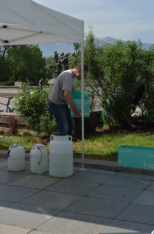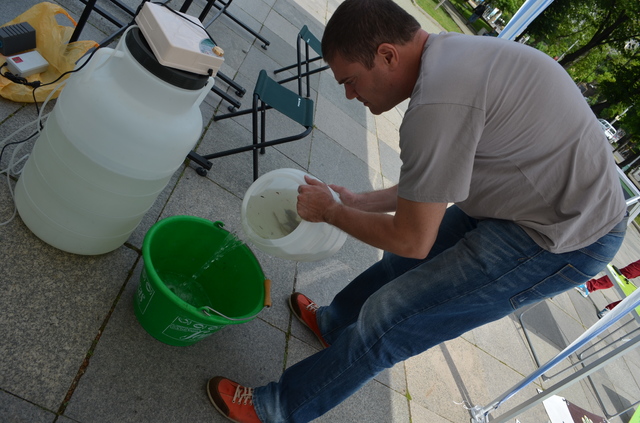 Понеже за пръв път правим такова нещо, разбира се, правим и всякакви открития кое как се случва. Най-същественото се оказа, че както и да действаме с охлаждането, понеже беше много топло вчера, в един момент температурата стана твърде висока в аквариумите. И се наложи към 17 ч. да приберем рибките по бидоните и да ги сложим да се охлаждат. Разочаровахме доста хора, които дойдоха след 17 ч., но няма как - най-важното е рибоците да са добре и в добри условия, че още доста път ги чака. Вчера вечерта бяха в много добра форма в бидоните си. А пък има и много други интересни неща за гледане освен рибките - игри, викторини, картинки и разкази за реките и обитателите им. Днес бяхме в Лом, нататък продължаваме по програма.