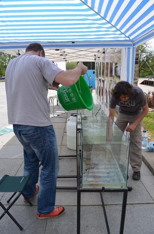 Лесно ще ни познаете отдалече, ще има бяло камионче с картинки, голяма надуваема шатра и един куп хора наоколо. Аквариумите, стойките и целият такъм са готови, имаме черни мренки, горчивки и щипоци. Дано всичко мине добре! Ще сложа снимки от инсталацията в сряда, като мине софийското мероприятие. Аз няма да съм лично с турнето през цялото време, но колегите ми ще бъдат.