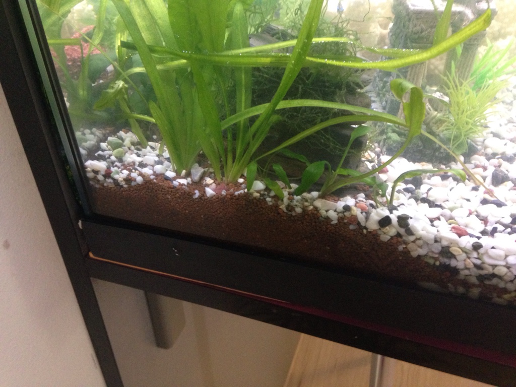 Един мой такъв аквариум със две молинези. Чакам женската да роди та да се напълни с риби. Слагам по една дневна доза торове веднъж седмично защото няма достатъчно риби да акат.