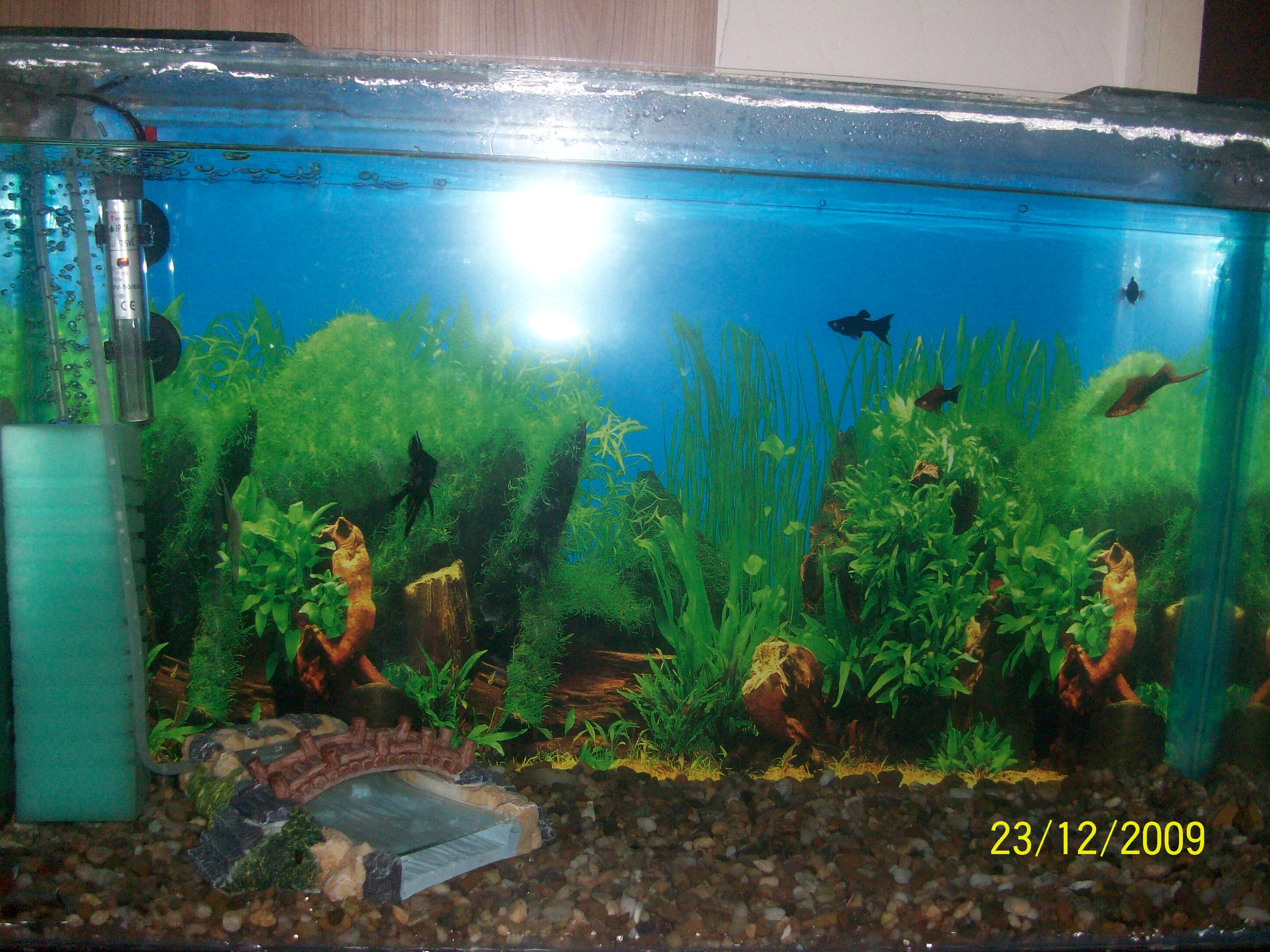 Ако не го снимаш със светкавица ще е много по-добре.Иначе не е лош аквариумът,но аз бих сменил фона отзад с едноцветен и бих махнал тези керамични декорации вътре.