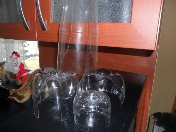 Основата на пешерите изградихме от дъната на бутилките от кока-кола (доста са стабилни) + дъното на една малка бутилка от минерална вода. Добавихме тунел от средната част на бутилката от минерална вода. Горната част на декорацията, която скрива помпата я направихме от половин бутилка швепс (оказа се по-стабилна от колите, които след разрязване се свиват на роло).