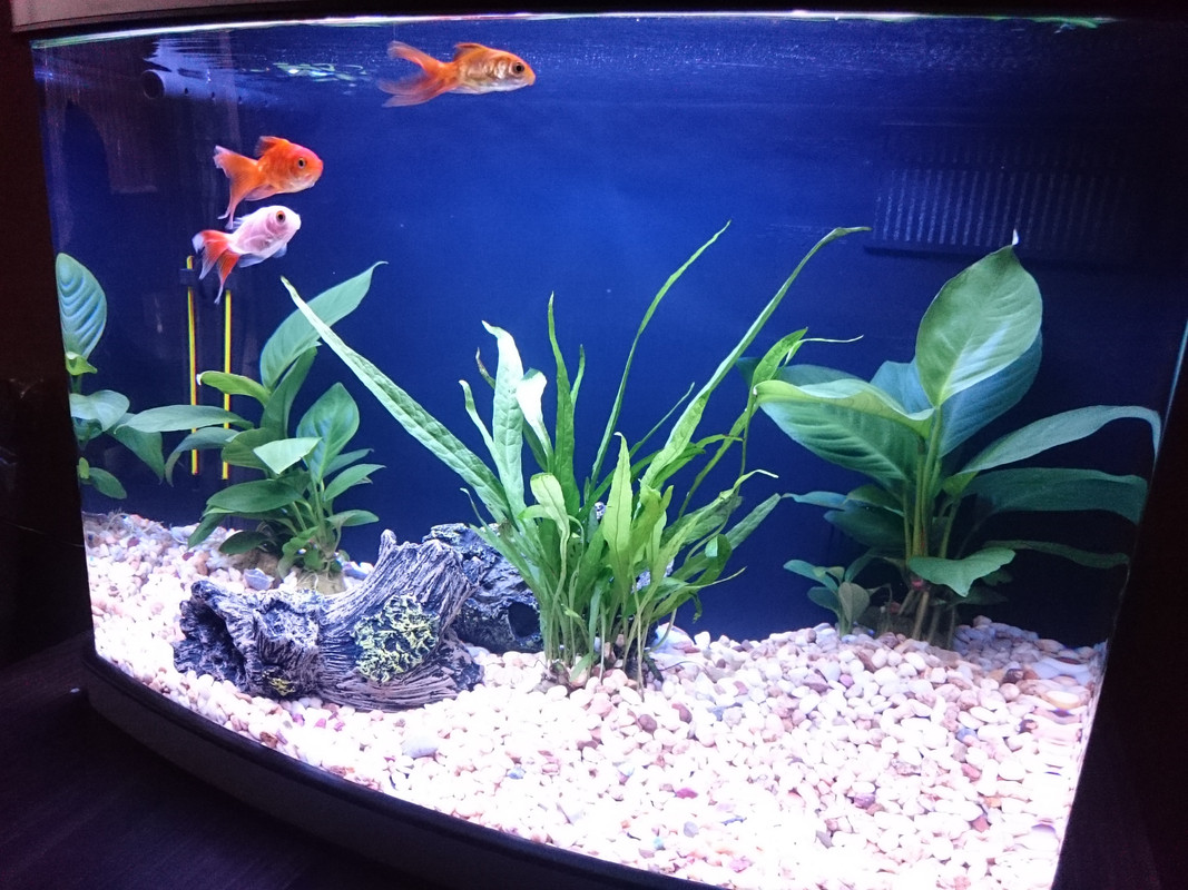 Таа така да започна от началото, рибоците ги имам от почти 7 месеца, в момента не се вижда но освен тези 3-ките имам и анцитрус калихт, но в момента не се виждат че са се скрили някъде  :-), бях със 33 литров аквариум без растения, то до преди 2 дена бях с него, но причината да го сменя, е че златните рибки бяха 7, а останаха само тези които са на снимката. Лично по мои наблюдения рибките ми умряха заради доста замърсената вода която се налива, въпреки препаратите които, използвам, въпреки всички съвети до които се допитах от уж хора които работят по магазини за такива неща. Нещото което се получаваше след смяната на водата(не е сменам цялата, 1/3 както съм чел и както са ме съветвали) беше накъсване на опашките, и след още 1 2 сменяния някоя си заминаваше. Правил съм сифониране тъй като от долу имаше 1 пръст камънчета(горе-долу 4 5 мм диаметър),процедури с FMC тъй като на едната рибка и беше паднало едното око(препарат с който водата става синя, прави се 3 дена подред) това го напраих защото занесох едната рибка която беше пред умиране до магазина, от който ги взех и там ми казаха да направя тази процедура, но резултата беше умиране на въпросната рибка като преди това умря и друга, накрая се стигна и до източване на цялата вода(веднъж на месец), пълнене наново използване на препарат за съовтетния литраж за премахване на твърди частици на sera aquantum(като тази процедура ест си е правех и когато се сменяше и 1/3). След като почнах цялостното сменяне на водата, провлема с очите изчезна, но рибките продължаваха да умират *SORRY*, и за това минах на този акварирум Hailea FA400, причината е че отзад има отделение зад това черното което се вижда на снимката има така доста добра филтрираща система, с която се надявам че проблема с водата ще изчезне. Като за още по-голямо причистване освен всичките филтри които има сложих и Seachem Matrix някъде около 350 грама, за растенията ще добавям 1 път на седмица Seachem Flourish, като са 2 х Анубиса, и 1 Миркозорум Minor, та до момента имам само 1 питане, тъй като помпата която си дойде с аквариума е 360 литра на час, но след всичките тези работи които са в аквариума, след наливане на водата събира около 45-6 литра 50 да са най-много, въпроса ми е трябва ли да мина на по-малка помпа или мога да си остана с тази  ?