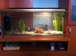 Аквариума мисля че го грее много малко светлина само сутрин при изгрез но огрява съвсем малко единия ъгъл на аквата. Така осветлението ще го намаля, лошото при мен е че осветлението ми е от крушки а не от пури но аквата не е моя и не мога да си направя както си трябва но скоро се надявам да си залепя моя.