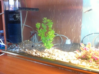 Така днес отидох до зоо магазин и оттам си купих нов грунд че пясъка ми позеленя, взех си 5литра грунд (незнам фракцията) и 1 литър бели камъчета че наще настояваха а те бяха с парите  :-D :-D :-D взех си и 3 изкуствени растения (като имам повее пари ще си взема и истински) те ще са временни и си взех лекарство на сера против ихтиото казва се sera costapur. Наредих и аквата и си я стартирах мацката каза че в началото ще е мътилка и с циркулация ще се оправи но лекарството не позволява тази циркулация с филтъра а само с аератора, сега рибите са на окло 29 градуса заради лекарството и аквата стана синя  :-D :-D :-D ето малко снимки