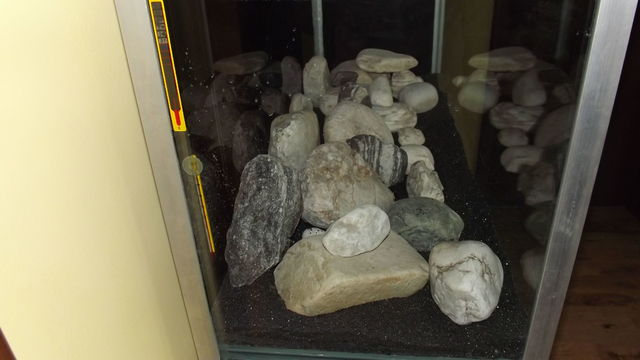 Хубави камъни, но като аранжировка изпълнението е слабо. Няма фокусна точка, скучно е. Какво бих направил - камъните да се разделят на две-три групи, едната от които да доминира по масив и височина. Да се виждат и петна само с грунд - по - големи и по-малки. Изобщо - половината камъни вън от аквата. Така е интересно. Мислил ли си за вертикален или диагонален елемент в някой край за динамика?