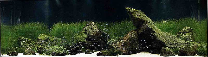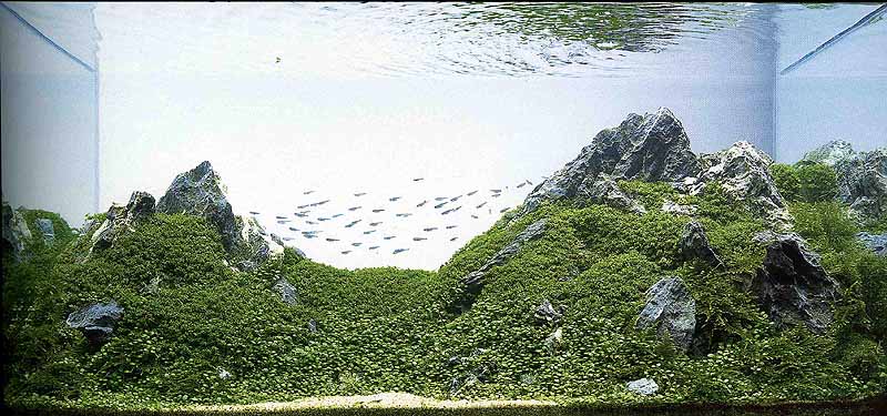 Eдно много важно нещо е да не сгрешиш и да използваш само един вид растение.  Отначало ще ти се струва готино, но такива акваскейпи бързо омръзват.  Също така за такъв тип акваскейп не бива в никакъв случай да претрупаш изгледа.  Просто казано може да сложиш малко Елеохарис тук-таме както и малко количество от други дребнолистни растения близко около камъните, все едно че са се увили леко в основата им да речем.  Така се създава интерес, а не просто вид на камъни + тревичка.