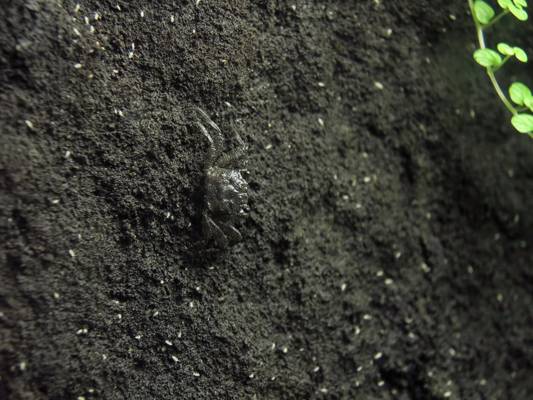 Малко текуща информация - малчуганите пораснаха доста, тялото им е вече към 12 мм. Още не са се оцветили. Предполагам, че цветът е признак за полова зрялост, но ще видим... Благодарение на Сахара, завъдих в палудариума популация от Collembola, което се оказа много сполучлив ход - и малките, и големите си ги хапват с голямо удоволствие. Днес успях да заснема единия младеж, а видях и ново поколение, вероятно току-що излюпени - около 2 мм *YAHOO*  Явно съм успял да създам подходяща среда, затова ще спомена и параметрите - вода 25 градуса, въздух 24-25 градуса, влажност 85-90%