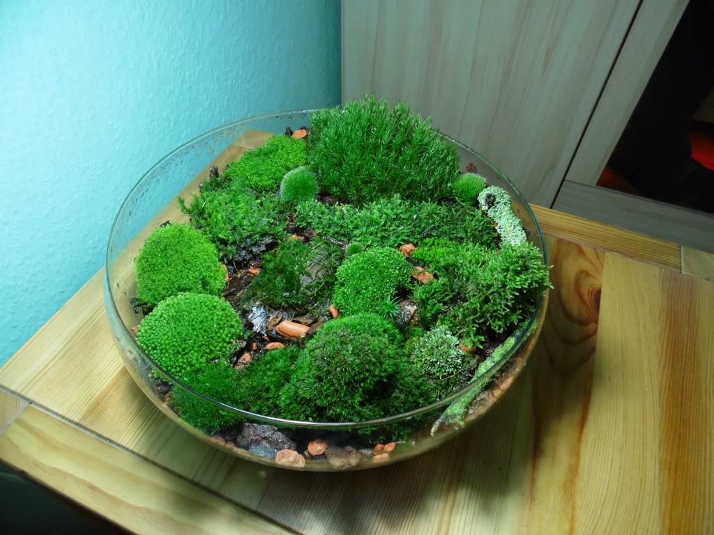 Преди известно време ми попадна една стъклена купа и веднага реших да си направя домашен "мъхарник". Дъното е от топчета за хидрокултури и субстрат за орхидей. Държа ги в неотоплявана стая на отворен прозорец и пръскам често.  :-)