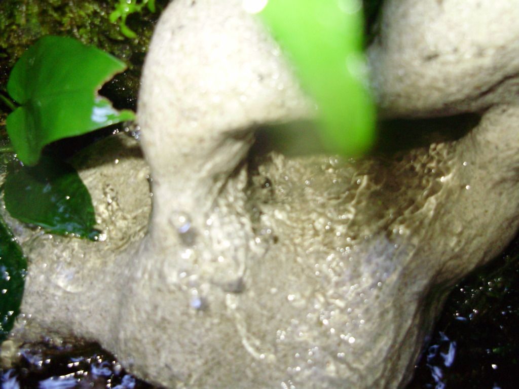 Бялото е един варовиков камък с дупка ,през който излиза водата като бързей,но на снимките не личи много.За рибите се притеснявам,че няма повече от 10-15 литра вода.