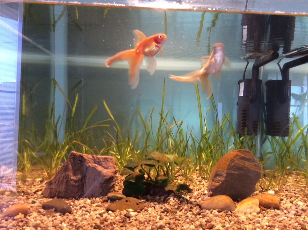 Привет на всички! Малко инфо, аквариума е с размери 50д/50щ/30в. - 75л. , Филтър вътрещен 500л/ч. , Ръстения Валиснерия, Анубиас, рибки: 2 златни мисля че са рюкини единия воален ако не се бъркам, Осветление лед крущка 40W. (студено бяла)