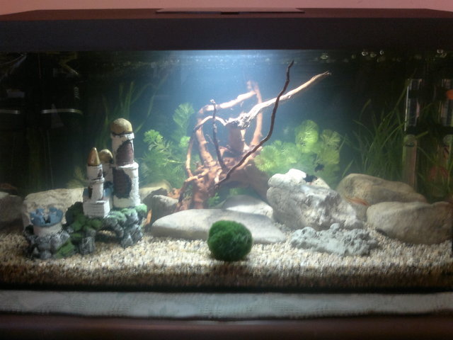 Добър ден на всички, и Весела Коледа.Аквариума е Aquael lledy 60,размери 60/30/30,с лед осветление 6w.Помпата не от комплеката,но пак е на Aquael мисля че 350l/h.Рибките са 2 анциструса едно Сае ,и 10 барбуса(не им знам точните наименования така че мисля да не се излагам :-)).Растенията са кабомба и валиснерия мисля.За сега мисля да ги оставя така но по нататък(примерно сле 10-15 дена) мисля да засадя и някакви за среден план.Аквата е стартирана малко на бързо но то е защото е подарък на малкия за Коледа.Ползвал съм на сера  препарат за бърз старт,и след избистрянето пуснах рибките.Останалите рибки мисля да ги пусна след 15-20дена и те пак ще са барбуси и може би една две боции защото забелязах 1 охлюв.За сега не виждам някакви видими проблеми но то само времето ще покаже.Моля за коментари и мнения за да мога да го подобря за в бъдеще доколкото мога.