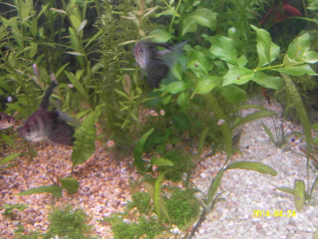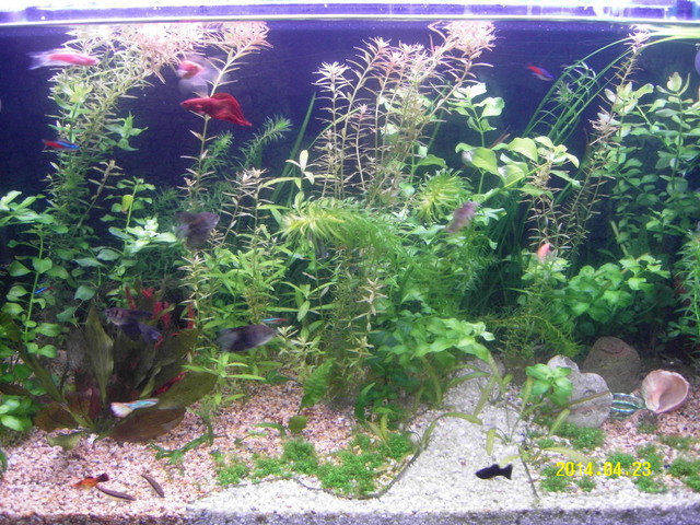 Обитатели 5 тернеции,5 неона,5 гупи ,2 саета,1 малко сомче,1бета,1молинезия - хранят се 1 път дневно изяждат храната за около минута .