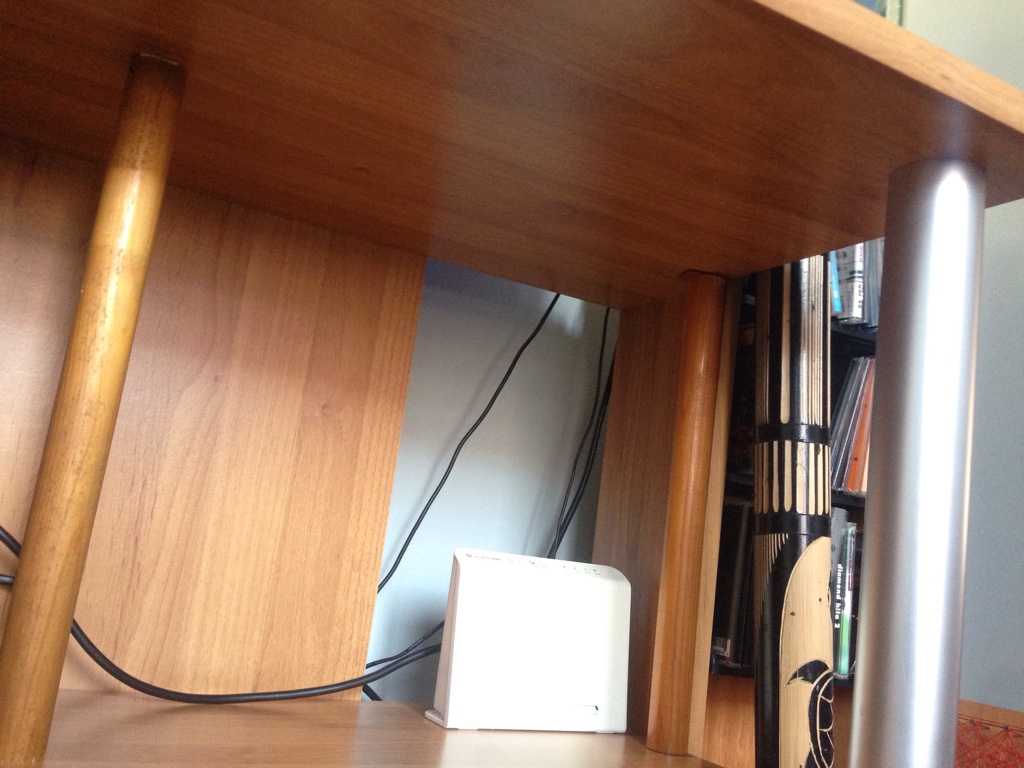 При слабо земетресение ще хване настрани. Дървените конструкции са нестабилни не при натиск отгоре, а отстрани. Вижда се един гръб отдолу, зад колоната, хванат за страничната плоскост и плота, средния и долния рафт. Тази група може да се укрепи без да се вижда, които не се виждат. Ако го направиш остават тръбите отпред-вдясно, които държат само вертикално налягане, но при странично хич ги няма. Вариант е да изтеглиш напред шкафа за дискове и той да се яви преден десен "крак", като няколкото здрави винта няма да се виждат.