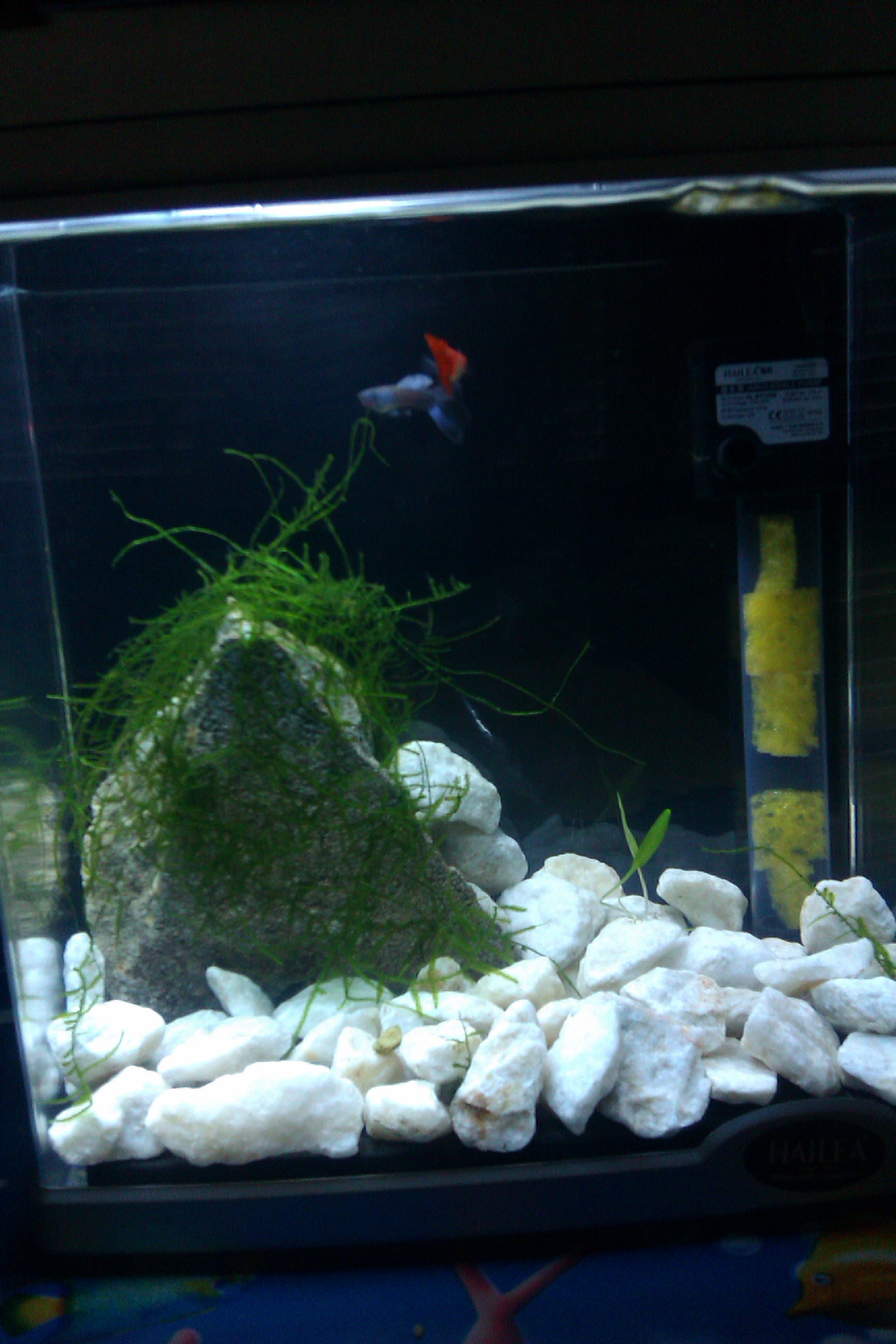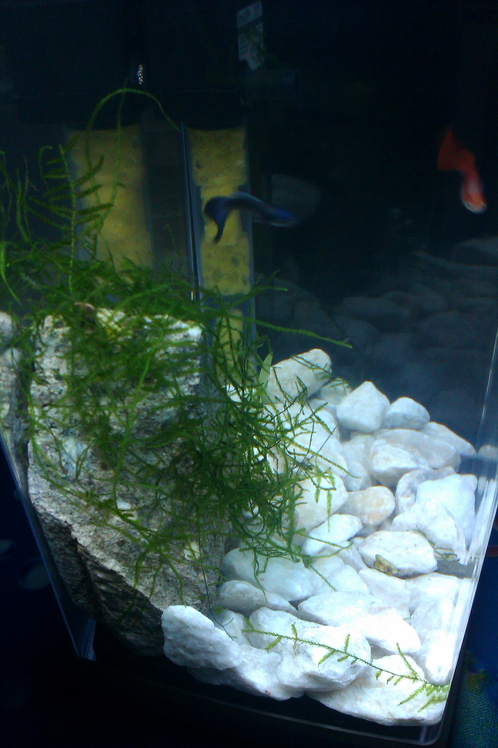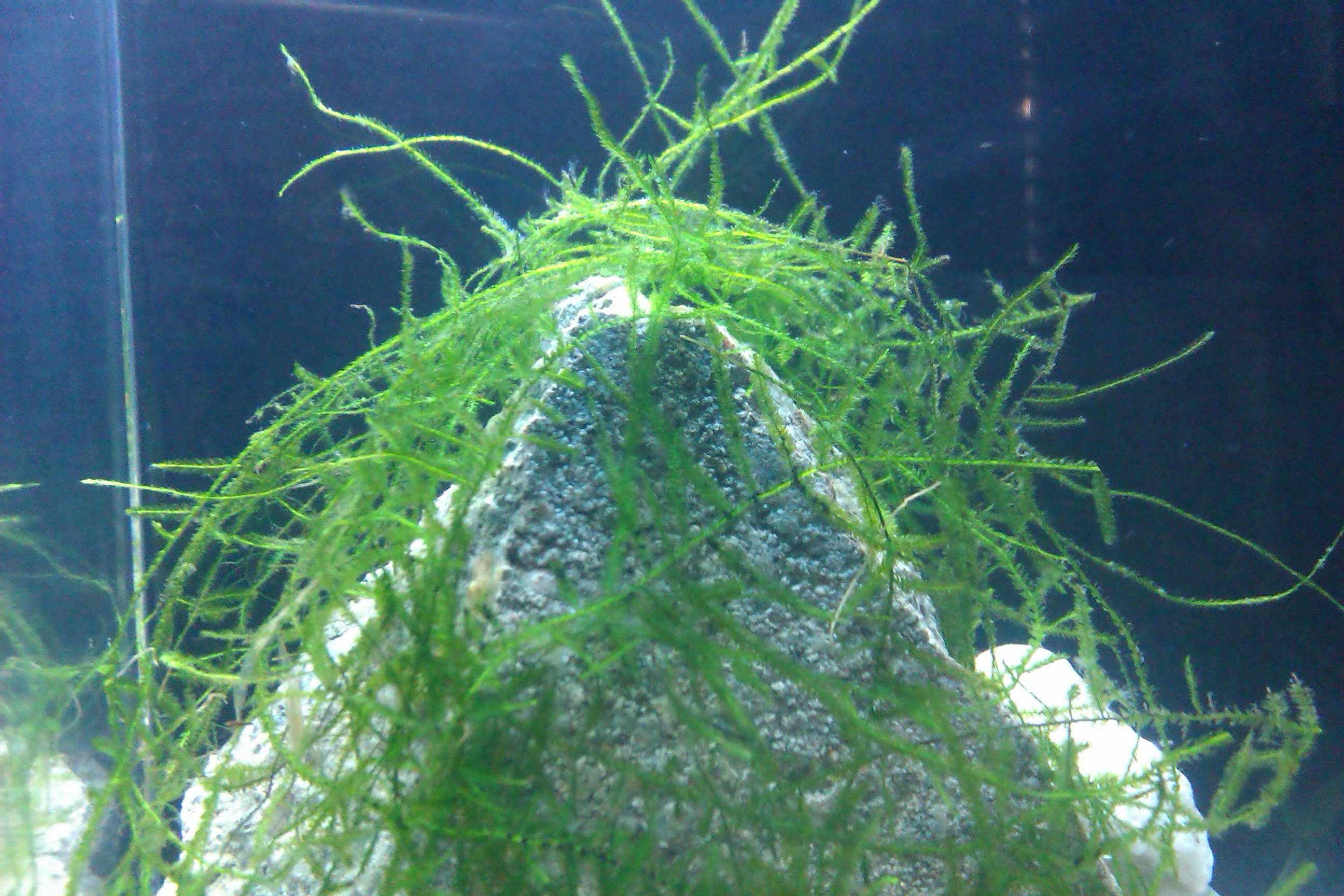 Търсих из Пловдив Анубиас нана и явански мъх или някакъв друг, но не намерих. От едно гаражче малко за рибки намерих някакъв мъх, който не знам какъв е, сложих го върху камъка като само леко го затиснах от едната страна с едно камъче и си стои там сега. Според мен се захваща защото като го донесох в него имаше заклещени 2 малки камъчета. Ще се радвам ако кажете какъв вид е.