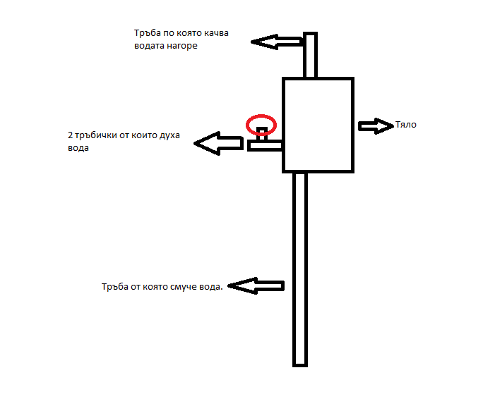 Така, там където е червения кръг има маркуч, които мога да мушна. като го мушна и другия край на маркуча е извън водата нищо не се променя, не става нищи и като другия край е във водата.