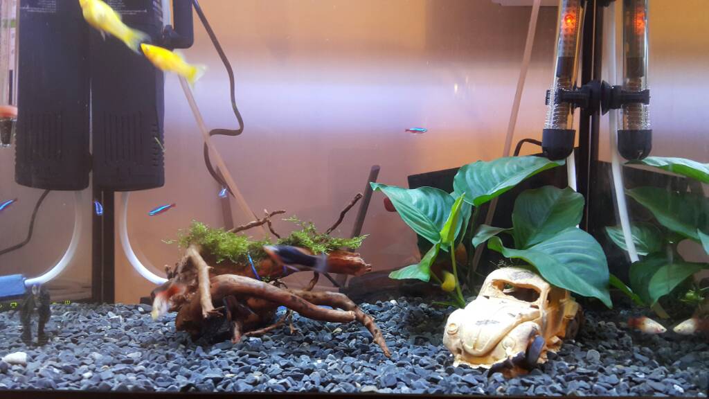 От събота имаме нови обитатели. 3 жълти молинезии и 3 плати. Би трябвало да са по един мъжки и 2 женски от вид. За молинезиите съм сигурен понеже лесно се познават, но за платите не мога да разбера. Много съм доволен от новите обитатели. Аквариума буквално оживя. Тези рибоци постоянно се движат а храненето е цяла атракция. Дори останалите 4 неона се размърдаха. А анубиаса пуска вече второ ново листо.