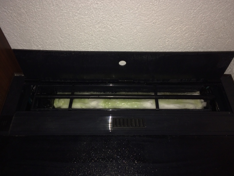 Дължината му е около 70 см. Сега все отгоре има памук за да махна зеленото от водата, но както се вижда и на снимката памука е слабо оцветен защото водата вече почти се пречисти.