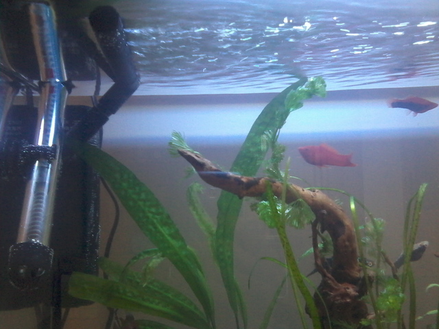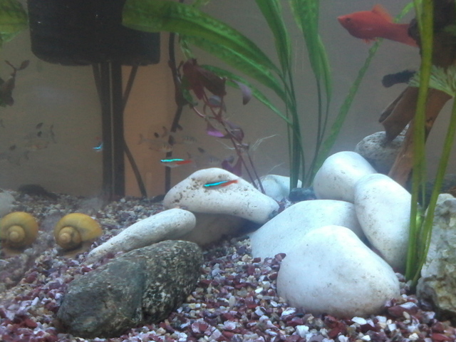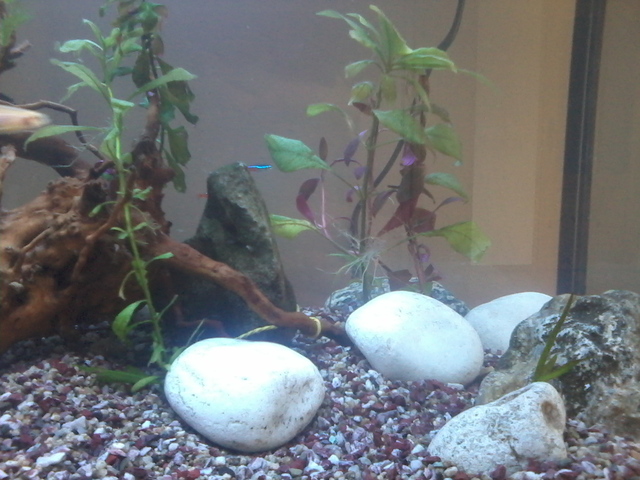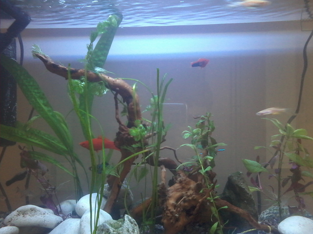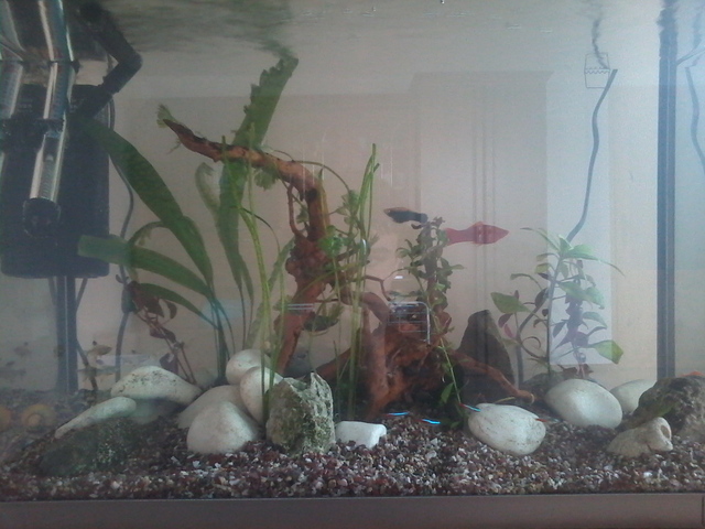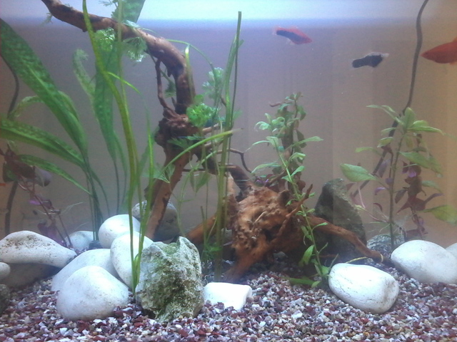 Аквариума е вече готов. Днес пуснах рибките :-) и мисля че нищо им няма. Да попитам за лампата кога трябва  да свети през деня или през нощта? Ето малко снимки на аквата вие ще кажете как е, защото имате повече опит в това. Рибките вътре са 4-хелера,2-данио,4-черен фантом,3-коридорас,5-неона,и 2-анциструса. Доста е беден на растителност, но мисля че когато пораснат тези растения вътре ще се по-запълни. На растенията не им знам имената :-D ако може да кажете какви са?