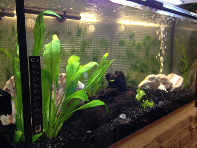 Старт на 20,10,2014 г. Аквариума е с размери 80х30х38см височина, грунд ВС07 ГК Бляскав речен чакъл 3-5 мм. от Горубляне с дебелина около 5 см, външен филтър JBL 701 (при старта сложих 1шишенце Filter Start на JBL), нагревател JBL 150W (след старта се поддържа температура 25 градуса), Осветлението е с лед ленти (четох доста във форума за да го избера надявам се е подходящо, светят по 8 часа), има и въздушна помпичка JBL 100. Водата е налята директно от чешмата. Има и една смяна около 30% вчера пак от водопровода. С растенията съм малко на ВИЕ, но като ги купувах продавачите казаха, че са лесни за гледане, няма система за въглерод.