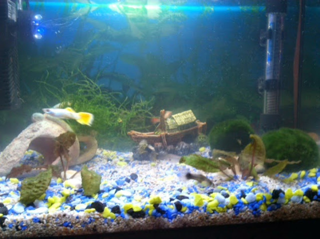 3. Декорация - две живи разстения, едно като топка, другото от тези свободно плаващите. Съжалявам, имената не запомних. Две изкуствени растения. Като надобрея, ще засадя още две-три естествени и ще махна изкуствените. Рапан и миди - знам , че не трябва да се слагат, но детето държеше на тях. Те, заедно с едно корабче и камък - старателно изварени.