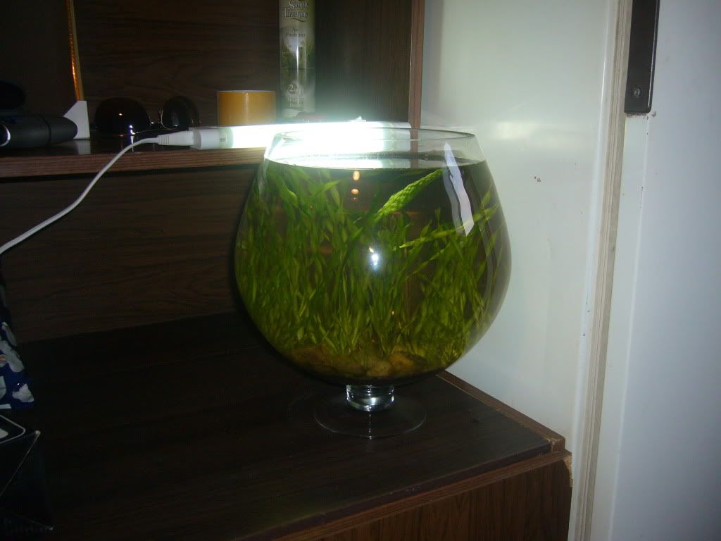 от такива аквариуми според мене няма смисъл колега защото е много голяма играчка с почистването но щом си започнал може д апуснеш 1 бета например или 2 трихогастера или други лабиринтови . но по добре си вземи нормален правоъгълен аквариум защото в този няма как да почистваш и си вземи нещо от сорта 50 60 литра а ако нямаш средства с това само ще си губиш времето НО ТОВА СИ Е МОЕ МНЕНИЕ