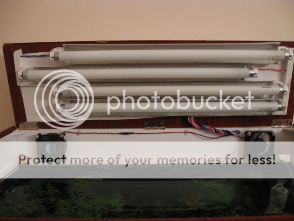 Преди около 2 седмици, темп на водата в 120 л ми аквариум се качи от 25 градуса на 28-29. Поставих два 8см вентилатора за компютър (около 3 лв бройката) на задната страна на капака. Единия вкарва, другия изкарва въздух. Махнах стъкления капак. Нищо ново или по различно от по-предните постове.