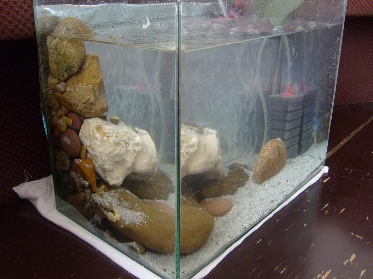 Moonce, струва ми се, че в този си вид аквариума не е най- подходящ за подрастващи живородки.Тази колона от камъни създава предпоставки за замърсяване между тях и почти невъзможност за почистване. Също и за "заклещване" на дребни рибки между тях. Пясъкък е много ситен. Няма никакви растения, а в един такъв аквариум има тенденция към повишаване нивото на нитрати, нитрити, амонии и амоняк- било от големия брой рибки, и то рибки с по-ускорена матаболиза, било от неизконсумирана навреме храна. За такава цел се оформят два типа аквариуми. Ако количеството на рибките е много голямо, обикновено не се слага пясъчно дъно, а само растения в саксии и още по- голямо количество плаващи. Идеята тук е да се постига някакъв баланс с чести подмени на вода и в големи количества. Може и на 100 %. Тогава се вади всичко от аквариума. Съответно филтрация и аерация. Възможен е вариант на напълно гол аквариум, но той се практикува най- вече при производители. Тогава се икономисва и осветление, работи се предимно с подмяна на вода и "химия".  При по- разумни количества рибета аквариума вече може да добие вид на класически- с грунд и някаква декорация. И пак много растения, обикновено по същата схема. Идеята е да може да се манипулира лесно вътре с кепчето. За това всякаква аранжировка се подбира така, че да е мобилна във всеки един момент.