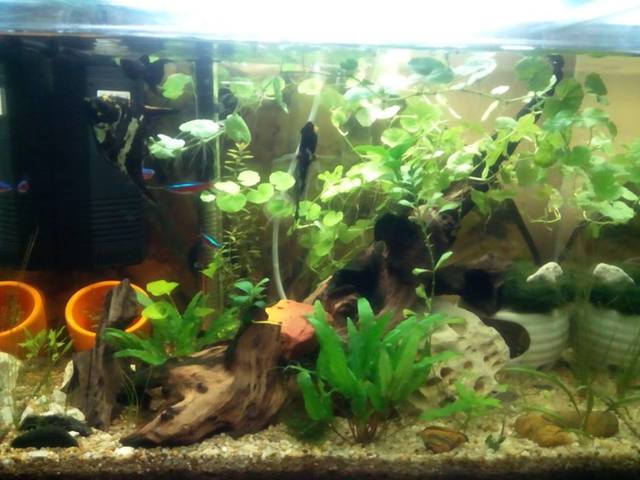 След старта на аквариума юни месец (1 месец след пускането му сложих рибките) започнах с 2 скаларии, 2 молинези, 2 плати, 7 неонки, 1 сомче, 2 коридораси, 2 анциструса.