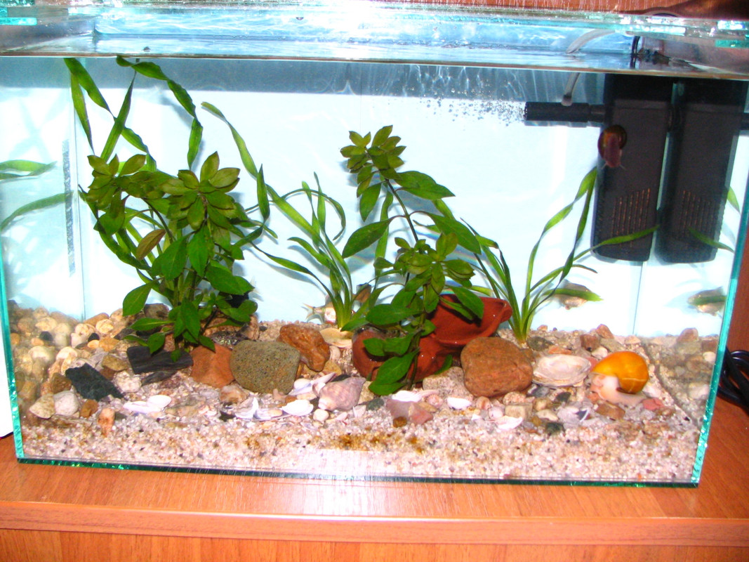 Дебелина на дъното: 3-5 см ситен + по едри камъчета отгоре. Едри камъни, миди и рапани за украса