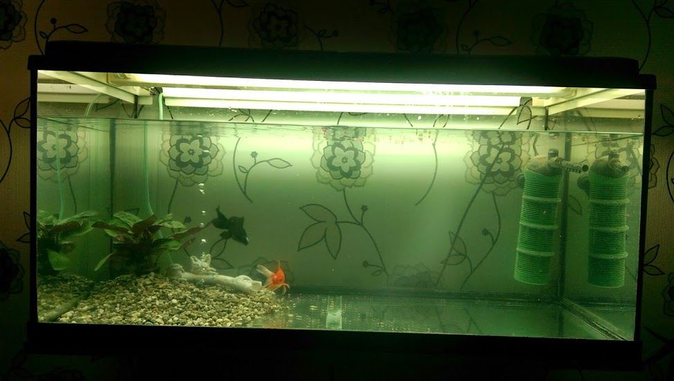 Здравейте. Купих  златни рибки преди 5 дена , не бях много запознат ( и запален по рибите )  и на прво време им взех 20 литрова колба с камъни и едно твърдолистно растение. На следващият ден вече бях прочел доста за рибите и се "зарибих" така да се каже , реших да им създам един добър дом. Започна търсене на аквариум подходящза моите любимци.  на 2рият ден им се появи нещо като мух на главите и на двете. на следващият ден вече им бях купил 180 литров аквариум с каменно дъно , размер на камъните м/у 3,5 до 5 мм , две видорасли за дъвкане и едно твърдолистно . Външен и вътрешен филтър (в момента работи само вътрешният) , помпа за въздух (балончета) и нагревател (не го пускам понеже температурата на стаята е постоянна м/у 20 и 24 градуса. Проблемът е че тази плесен или мъх, или гъба не се махна , а като са на повърхността не се забелязва. Водата е още мътна понеже е от скоро аквариума , на места пише сол във водата , на други , че нищо им няма факт е че си плуват свободно , закачат се ( играят) , апетит имат и не са плашливи . Възможно ли е да не им е достигал кислорода в малкият аквариум и това да ги е увредило ( там бяха често на повърхността и "дишаха" с уста над водата... (от както са в новият това  не го правят) ! В тъпата колба седяха 3 дена като сменях водата един път изцяло и два на по 30 % ! Сега вода не съм сменял , ще я оставя да се изградят бактерии и да се избистри и на 5 ден ще сменя 20 литра  - 10%. Добавям снимки , моля за компетентни отговори !!! *HELP*  *MODERATOR* *BRAVO*
