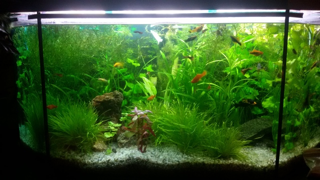 Започвам да смятам, че може да са били заразени, защото и моите почнаха да измират и то с много бързо темпо (само гупите) . До сега нямаше с наядени опашки, а само им се свиваха, след което умираха. Сега вече опашки не им останаха. Снимала съм, дано да се вижда добре. Не мисля, че им е тясно и това да е причината, но качвам и снимка на целия аквариум, за да си кажете и вашето мнение.