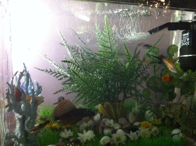 Чисто и просто си нямаш азотен цикъл или поне не е много стабилен. Накъсаните опашки не са само признак на агресия от другите риби, а често и показател за влошени параметри на водата. Някога тествал ли си си водата? С тази подредба на аквариума и неправилно насочена струя от филтъра, изненадан съм, че все пак имаш живи риби, че и голям сом. Сложи си нормален грунд за аквариум, а не изкуствени полянки с маргаритки и изкуствена украса за плод-зеленчук. Това, което прилича на корал, хич няма да го коментирам защо и дали трябва да е там. Похвално е, че се прави нещо за децата, ама защо се мъчат рибите? Ти би ли живял в гумена стая от 10 кв.м. пълна с камъни и нахвърляни дървени трупи с още 5 души, примерно. Рибите си имат изисквания и трябва да се придържаме първо към тях, а после към прищевките си.