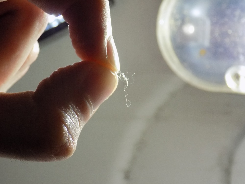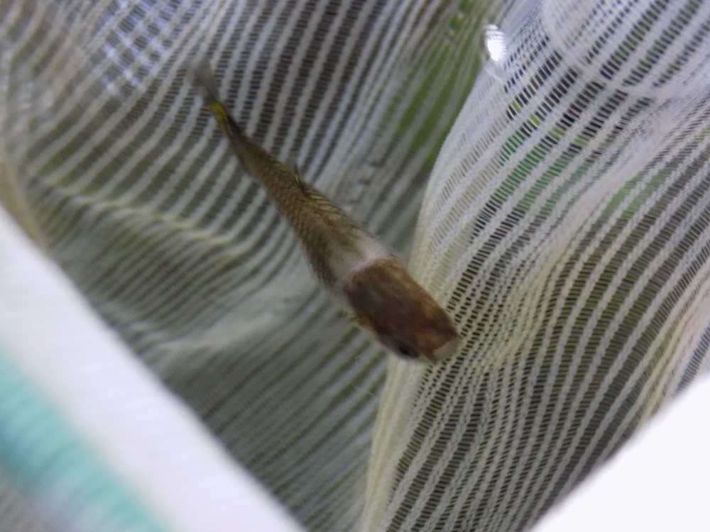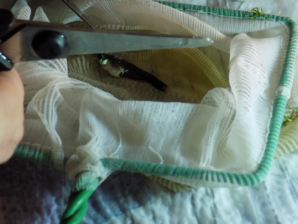 Доста силно се беше стегнала, защото чак корема й се беше деформирал и част от люспите липсваха. Хванах я, извадих я, с остър нож и малка пожица отрязах кордата. Беше трудно и пипкаво, защото се беше впила в нея и е доста дребна. Наложи се да я топвам в аквариума през около 40-50секунди, за да не загине. След няколко топвания, я освободих от кордата, сложих я в много блед разтвор на калиев перманганат за 30 минути и я върнах в аквариума.