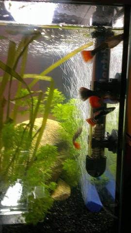 От началото всичко беше добре , докато не се събудих сутринта и не ги намерих лениви и всичките събрани на куп в единия горен ъгъл да цокат от водата , четох малко , хората бяха писали , че може би се стресирани от помпата , спрях я за един ден , никаква промяна.Умряха ми 2 мъжки , та реших , че може да е нещо от рибите и си купих нови 3 мъжки от друг магазин. Смених по 1/4 от водата следващите два дни и никаква промяна , просто смениха ъгъла , почнаха да се крият до отоплителя.