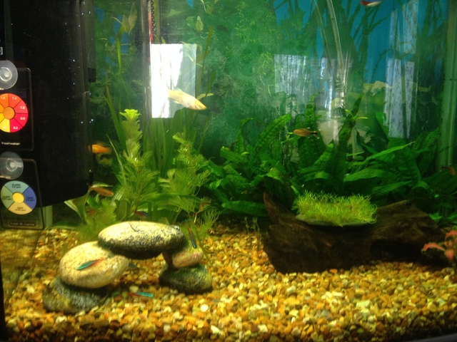 благодаря колеги снощи се занимавах до 12ч полунощ да сменя водата на рибките,немога да кажа дали са подобре защото останаха само тетрите а те и преди непрояваваха капризност  и тъкмо се  появи светлина и гледам едната неонка е побеляла от едната страна.промените в акваруима са следните:сменена вода 40л,сменен филтър на тетра in600 ето и снимка на неонката