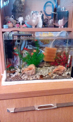 Незнам от кое точно е било, но рибките ми вече са добре :) Весели, държат се нормално.... Започнах да им слагам филтрирана вода през ден по около 2 литра и избеляването изчезна.... На филтъра започна да се образува и нещо като прозрачна ципа ( четох някъде из форума че така се образуват колониите от полезни бактерии ). Ето и моите сладурковци в скромния им дом :)