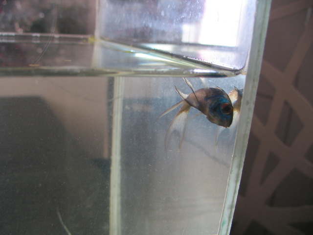 2.Синьото воално рамирези е зле, май бере душа....Още от началото, когато взех аквариума (преди 10 дни), то седеше доста плахо в горната част, почти винаги скрито в листата на криптокорината(мисля, че така се казва). Доминантния мъжки го гони, двойката всъщност гони всичко живо. От 3 дни обаче, не се храни, не мърда от повърхността, стои скрит до преливника на филтъра. От вчера седи леко на една страна, а днес е с хаотични движения - излезе  за малко от укритието и плуваше спираловидно, върти се. Преместих го в едно малко аквариумче, което си няма нищо все още, без филтър и топлинка....Но се притеснявам ,че след като рамирезито е болно, би могло да зарази другите. Моля за съвет, какво да правя с рибката, мога ли да я спася?? И как да разкарам брадата?
