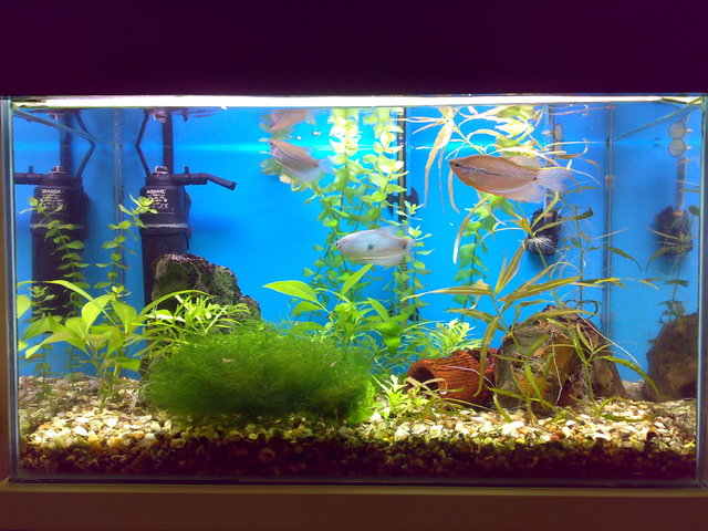Аквариума е стартиран на 16.04.2011г. На всеки месец, месец и половина сифонирам грунда и чистя и филтъра. На 7-10 дена сменям по 20 литра вода. Аквата е 70 литра. Филтър Aqua EL Fan 1 Plus, осветление Sylvania Aquastar 18W и Philips 865 18W. Осветление се включва в 11:00 и изгася в 19:00ч. Всяка сутрин слагам 2 мл. глутаралдехид и 1 мл. Easy life Profito. Обитатели: 3 трихогастера леери, 2 сини трихогастера, 1 чифт анциструси, бебета анциструсчита (около 10бр.) , ред черита (около 20-30бр.) , Охлюви Хелена (около 15 бр.) Общо взето това е :)