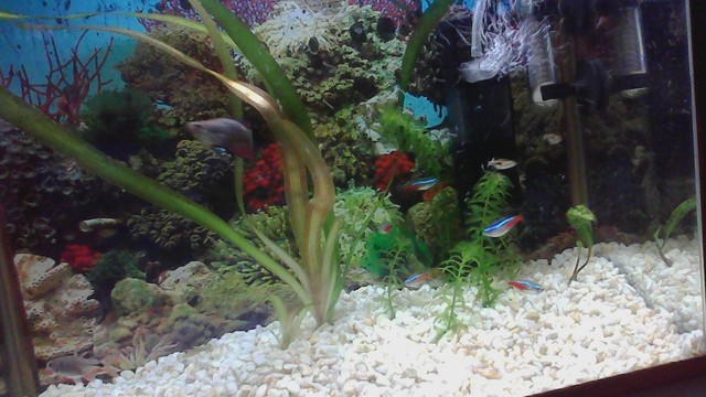 имам 6 Неона, 2 Разбора, 1 Фенерче,1 малък Хелер и 1 Бета. за сега се разбират, само Фенерчето винаги е гладен, имали вазможност фенерчето да хапи опашки...Училище...